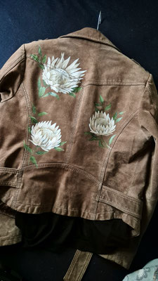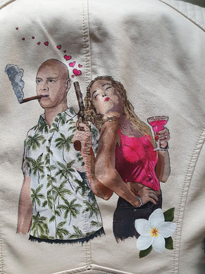 Anouk liet mij het kunstwerk van Marianne Naerebout, dat zij ook gebruikt had voor op het trouwkaartje, naschilderen op haar crème leren jasje. Het werd een super gaaf kleurrijke jasje dat ze jaren en jaren nog zal doordragen.