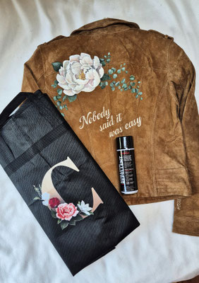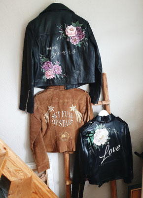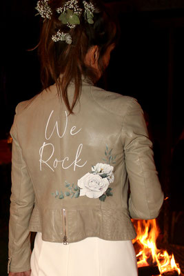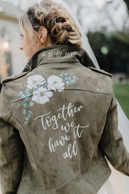 Zo liet Jodi van @liefthuis haar suèdine jasje beschilderen met hun trouwkaart.