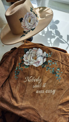 - Deborah had gekozen voor een zandkleurig jasje met leuke speelse franjes waarop ik de schouderpartij mocht voorzien van Mrs en naam, trouwdatum en mooie roosjes.