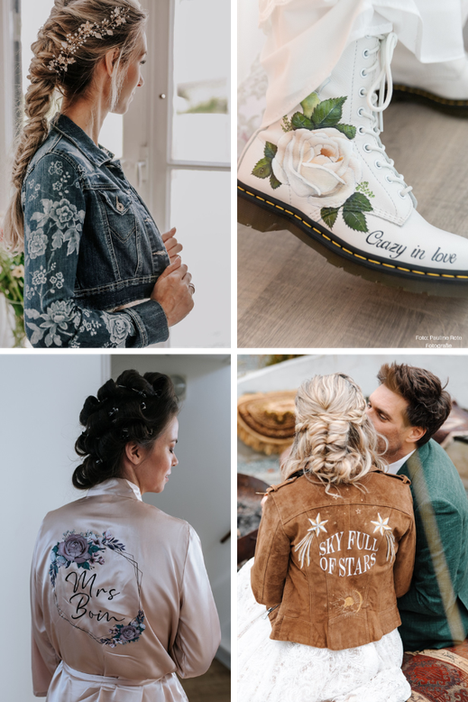 Trouwjasjes, schoenen, hoeden en kimono's beschilderd, geborduurd of bedrukt, altijd persoonlijk en passend bij jullie verhaal en stijl.