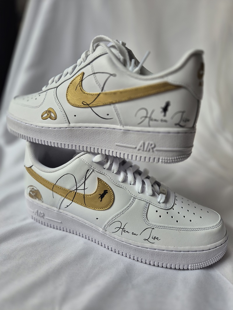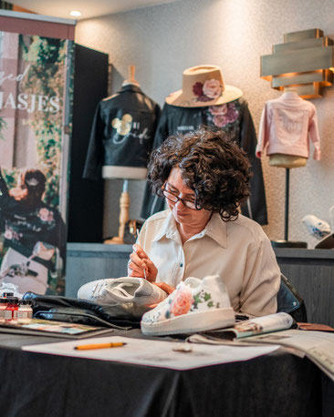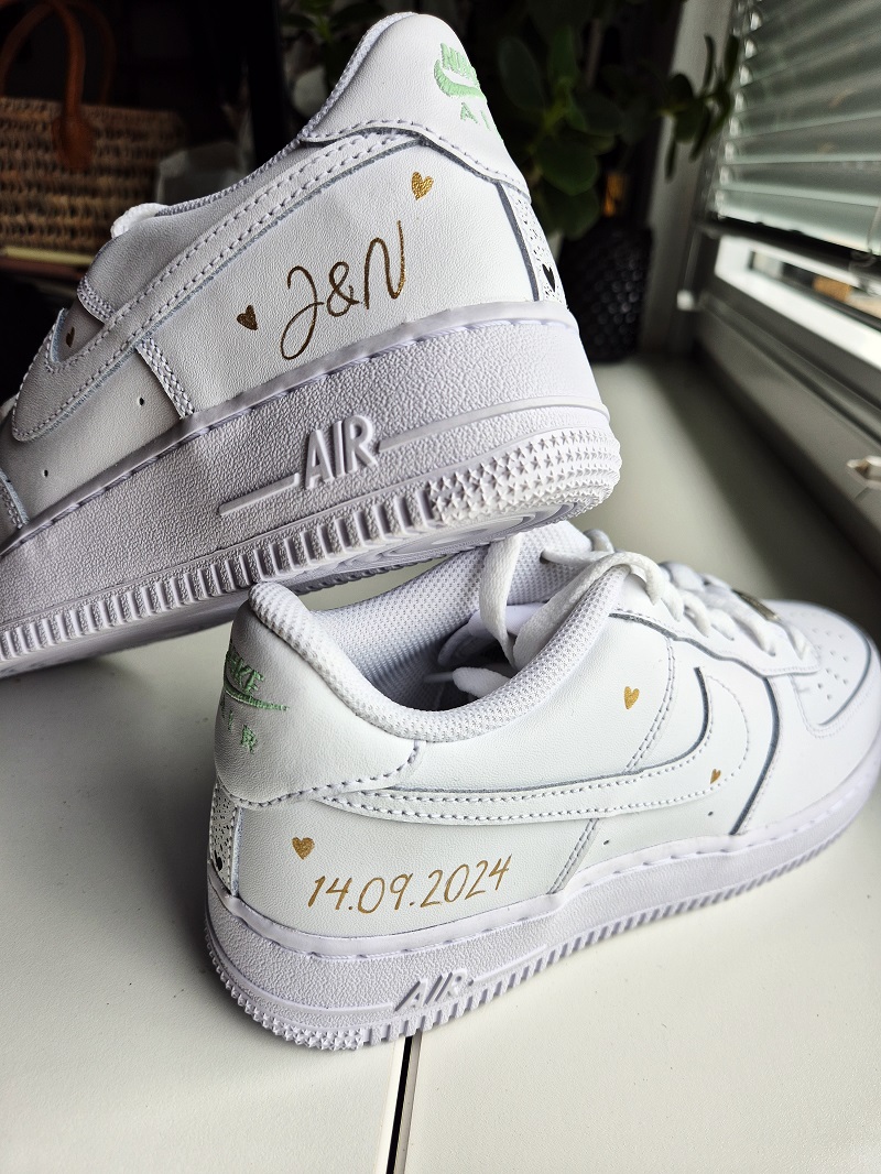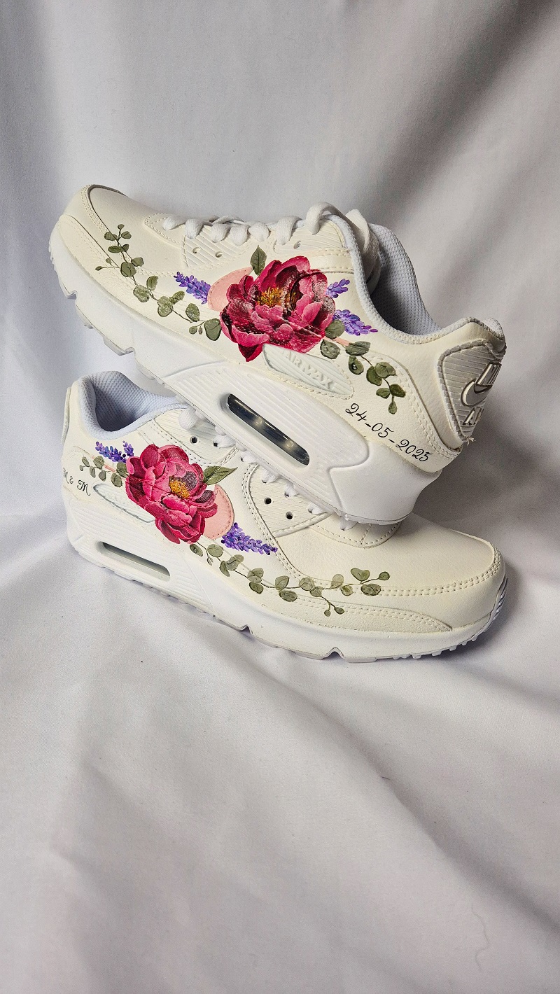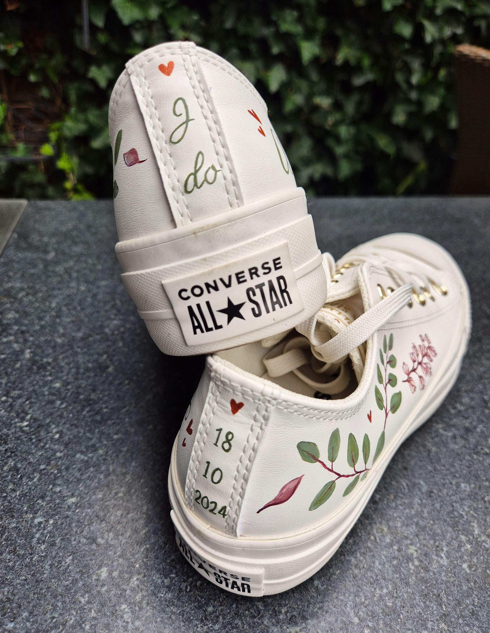 Met speciale verf beschilder ik sneakers met trouwdatum en monogrammen of namen. Vaak neem ik het lettertype over van de trouwkaart of je maakt een keuze.