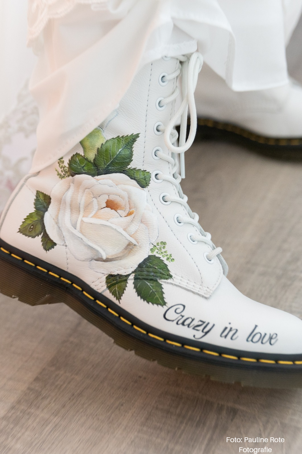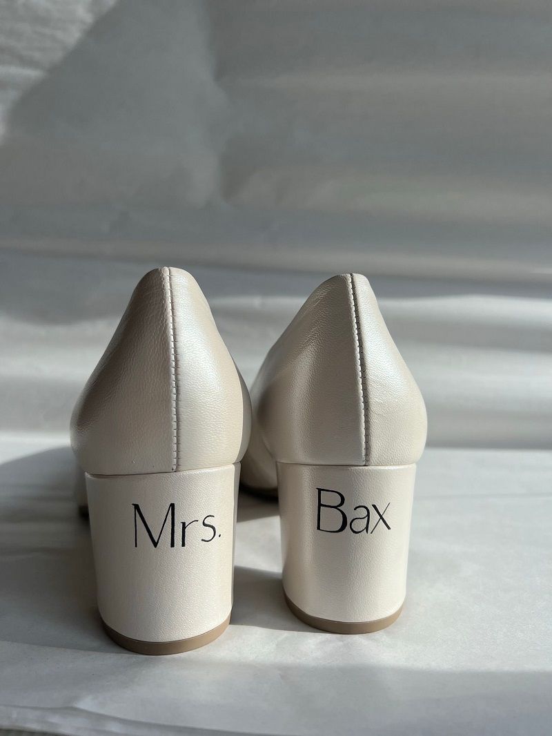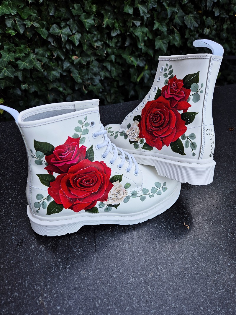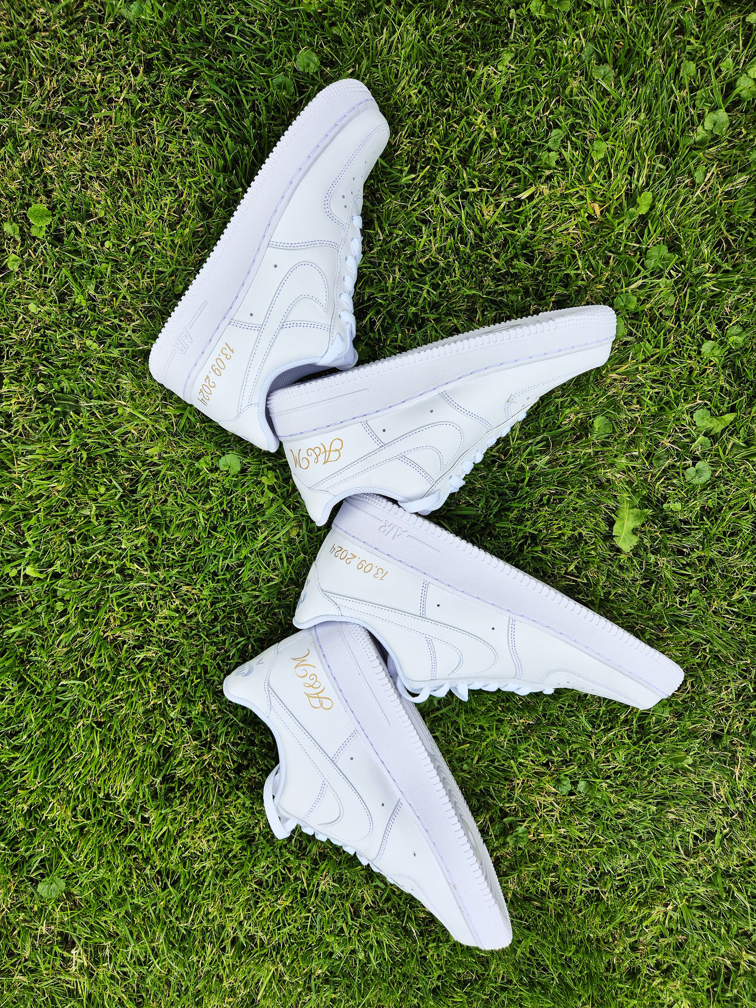 Met speciale verf beschilder ik sneakers met trouwdatum en monogrammen of namen. Vaak neem ik het lettertype over van de trouwkaart of je maakt een keuze.
