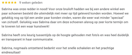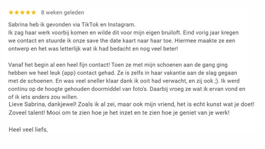 Ik ben Sabrina Adriaansen en denk graag met je mee. Samen kijken we welk ontwerp het beste bij jou past, zodat jij vol trots de eerste stappen in jullie huwelijk zet, op schoenen die niemand anders heeft.